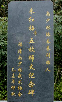 五枚師太原名朱紅梅(1650-1763),出自民間小說《萬年青》,傳說中被燒毀的南少林寺的少林五老之一,係明朝皇室宗親後裔,生於明朝天啟三年,享年113歲。六歲跟府中的將軍學習武功,九歲跟御醫學中醫理論並修煉禪功。明末清初,漢人因不滿清政府統治,揭竿反清復明。在福建,以鄭成功為首的反清之風更加高漲。反清失利後,皇室宗親難逃清廷劫殺。但是民間武林高手仍以福清南少林為秘密據點,奮力反抗。年僅二十歲的朱紅梅在長輩保護下逃離了這場劫難。她為廣大災民的悲慘命運及抗清義士的豪情所震動,在東張鎮少林寺附近修建尼姑庵,自號"五枚"。